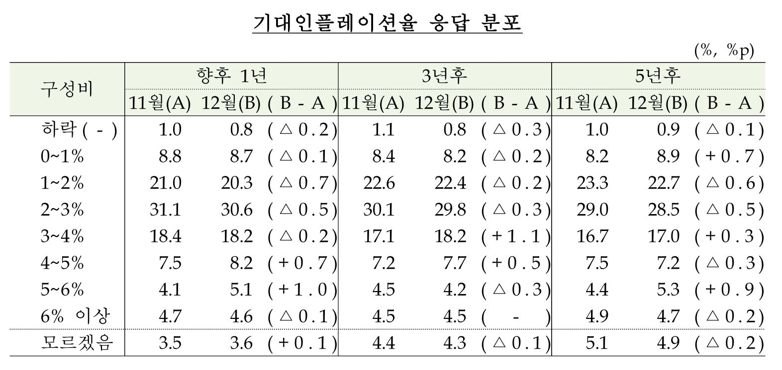 - 향후 1년간 기대인플레이션율에 대해 2~3%대의 응답 비중이 가장 많았으며 비중은 전월 대비 0.5%p 감소하였고, 3년후 및 5년후기대인플레이션도 2~3%대가 가장 높은 비중을 보였음