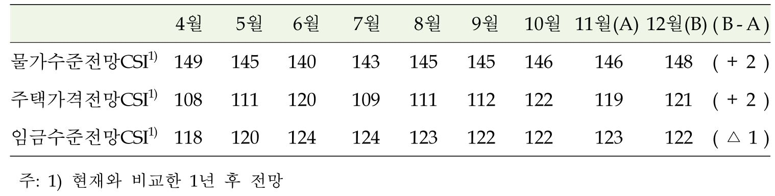 - 주택가격전망CSI(121)는 전월 대비 2p 상승하였으나, 임금수준전망CSI(122)는 전월 대비 1p 하락
