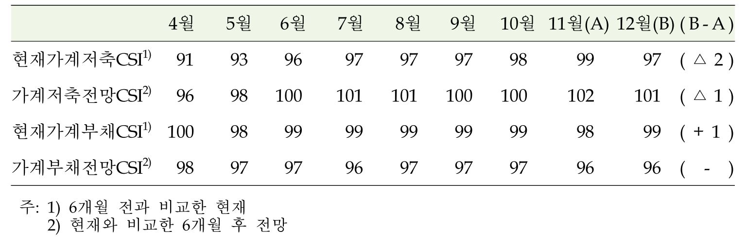 ㅇ 현재가계부채CSI(99)는 전월 대비 1p 상승하고 가계부채전망CSI(96)는 전월과 동일