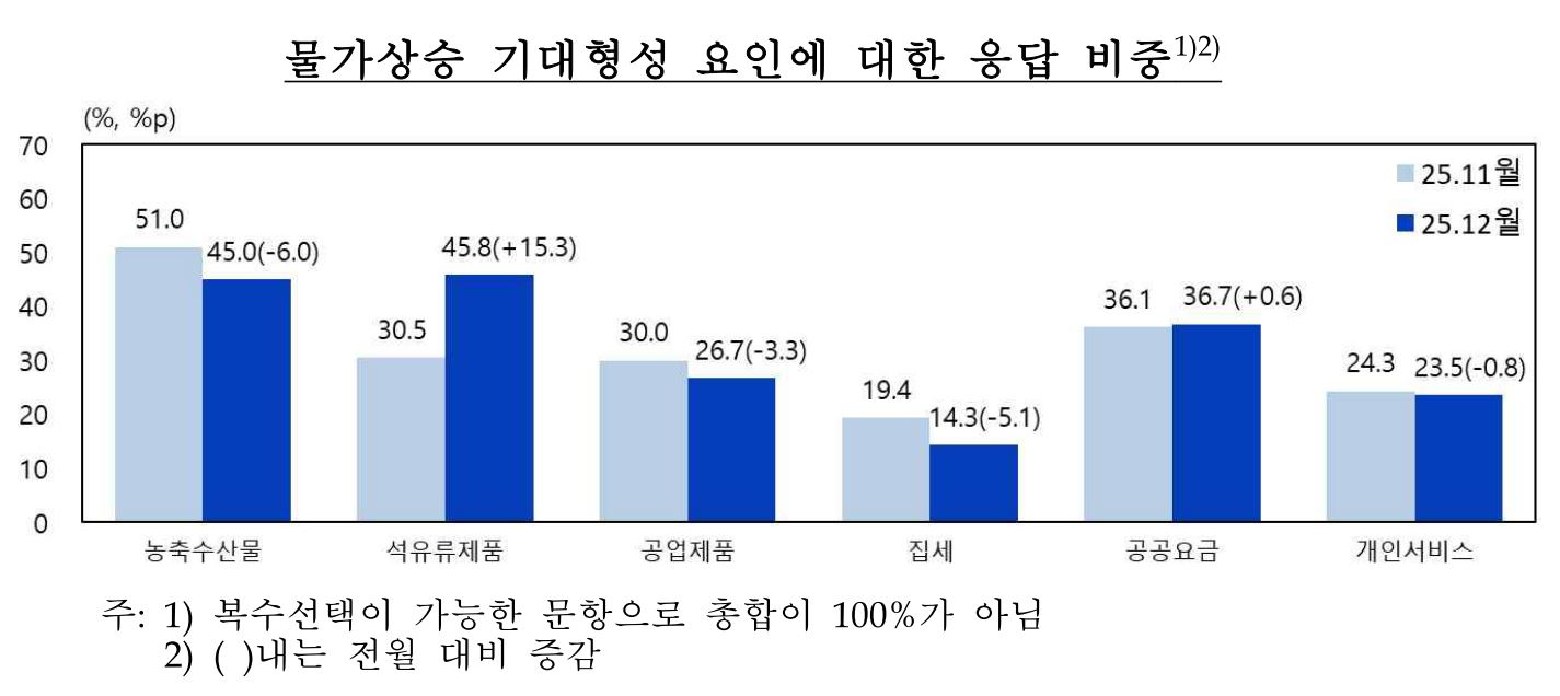 - 향후 1년간 소비자물가 상승에 영향을 미칠 주요 품목의 응답 비중은석유류제품(45.8%), 농축수산물(45.0%), 공공요금(36.7%) 순이었으며, 전월에 비해서는 석유류제품(+15.3%p)의 응답 비중이 증가한 반면, 농축수산물(△6.0%p), 집세(△5.1%p) 비중은 감소