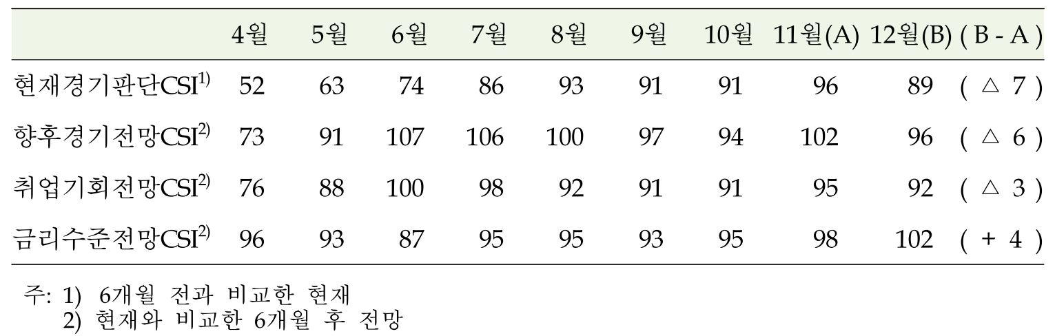 ㅇ 현재경기판단CSI(89) 및 향후경기전망CSI(96)는 전월 대비 각각7p, 6p 하락