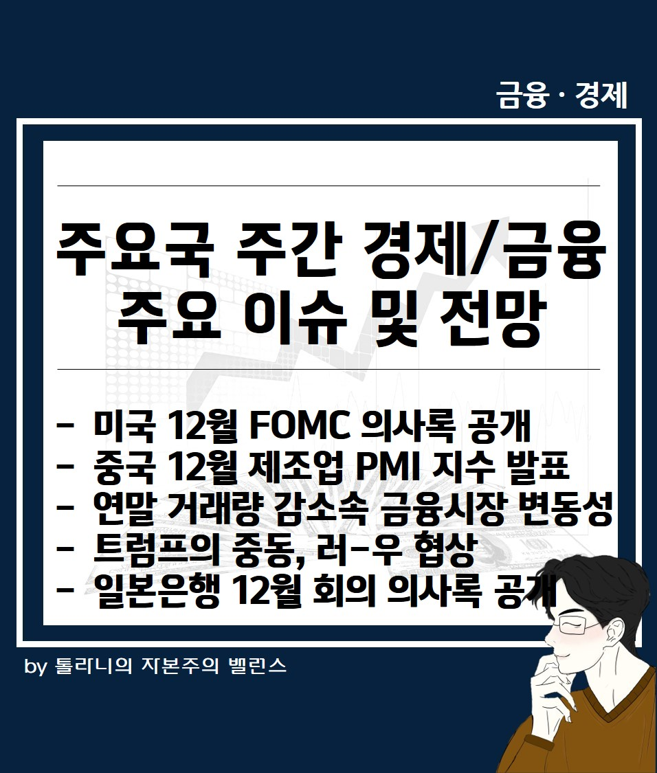 이에 '미국 12월 FOMC 의사록 공개, 중국 12월 제조업 PMI 지수 발표 등 주요 국가 주간 증시 일정 및 경제·금융 이슈' 관련하여 언론 보도 및 국제금융센터 보고서를 통해 좀 더 자세히 알아보도록 하겠습니다.