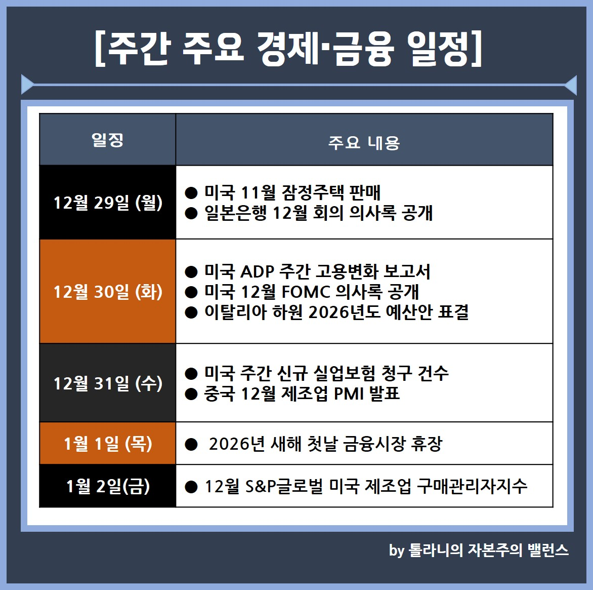 이번 주는 2025년 마지막 거래와 2026년 새해 첫 거래가 이루어지는 주간입니다. 이번 주는 특별한 이벤트가 예정되어 있지는 않지만, 2026년대의 증시 상승의 시장 기대감은 큰 것으로 분석되고 있습니다.