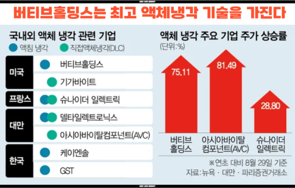 AI반도체는 하루 종일 고연산을 하여 발생하는 내부 열이 엄청나다. 그래서 냉각 기술이 필수인데, 대표적인 기업으로 "버티브 홀딩스", "슈퍼마이크로 컴퓨터", "델" 등이 있다. 먼저, 이 분야 최고인 버티브 홀딩스는 전력 및 냉각 솔루션 제공 기업으로 액체, 냉각 관리에 특화되었고 특허가 무려 850개 이상이 있다. 최근 인텔 가우디3 AI 가속기 냉각 인프라를 지원하는 소식으로 1년간 277% 이상 상승하였다. 슈퍼마이크로 컴퓨터 같은 경우 AI 및 직접 액체 냉각 솔루션 제공하며 엔비디아와 협력하고 있다.