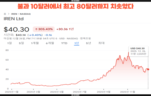 아이렌의 실적을 보면, 4분기 매출이 1억 4,482만 달러로 전년 대비 155% 상승했고 순이익도 2,423만 달러로 흑가 전환도 달성하여 올해는 아이렌의 실적은 정말 유의미하다고 볼 수 있다. 실적이 좋은 만큼 오래 투자한 사람들은 차익을 실현할 것이고 이제 막 아이렌을 알게 된 사람들이라면, 현재 관점보단 조금 조정받은 후 천천히 진입하는 것이 내 돈을 잃지 않는 방법이기도 하다.