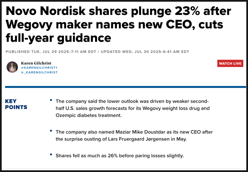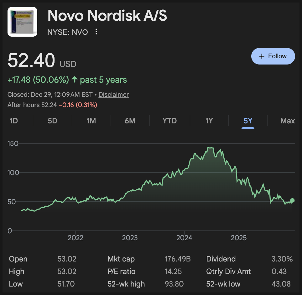 하지만 이후 경쟁이 본격화됐고, 특히 일라이 릴리(Eli Lilly)가 강력한 비만 치료제를 들고 나오면서 시장 구도가 바뀌기 시작했죠. 여기에 가격 압박, 공급 이슈, 그리고 성장 속도에 대한 의문까지 겹치면서 주가는 길게 조정을 받았습니다.