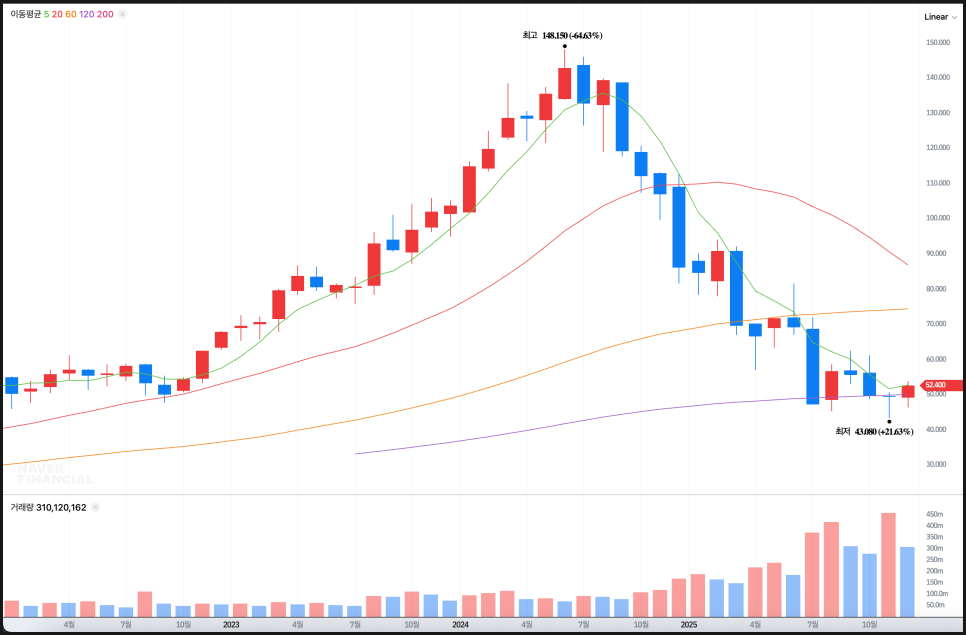 다만 아직 추세 전환을 확정 짓기에는 이른 구간이기도 합니다. 120일선과 200일선이 위에서 강하게 내려오고 있어서, 중장기 추세는 여전히 하락 쪽에 기울어 있습니다. 쉽게 말해 단기 반등은 확인됐지만, 장기 하락 추세를 완전히 꺾었다고 보기는 어렵다는 얘기죠.