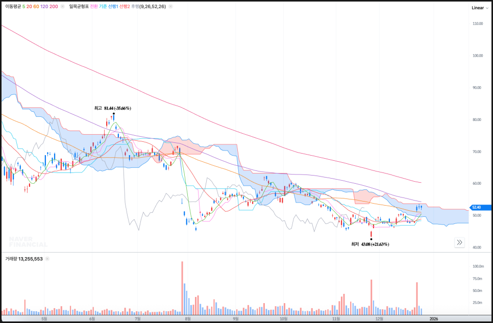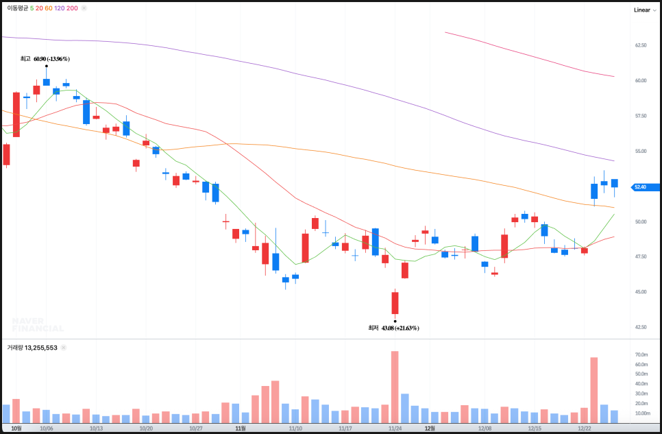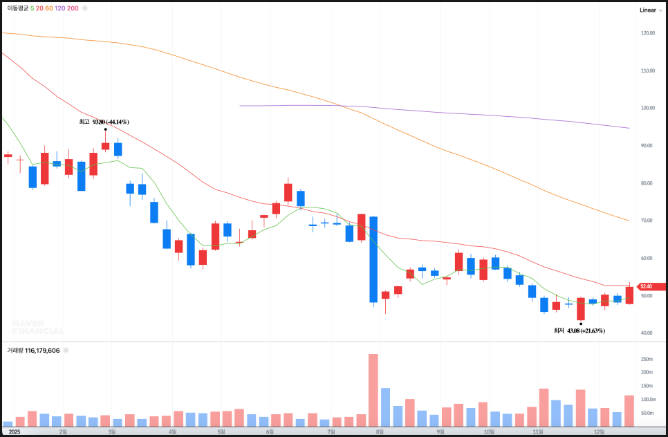 정리하면, 43달러 저점은 의미 있게 지켜졌고 단기 바닥 신호는 나왔습니다. 다만 지금은 추세 전환 초입인지, 뉴스성 반등의 끝인지가 갈리는 자리입니다. 52~55달러 구간을 거래량을 동반해 유지할 수 있느냐가 다음 방향을 결정짓는 핵심 포인트로 보입니다.
