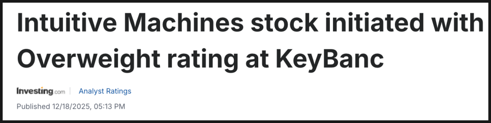 다음으로 키뱅크(KeyBanc)는 2025년 12월 18일 인튜이티브 머신스 주식에 대한 커버리지를 공식적으로 시작하면서 Overweight(비중 확대) 의견과 20달러 목표 주가를 제시했습니다. 키뱅크는 인튜이티브 머신스를 루나 터레인 비히클(Lunar Terrain Vehicle) 프로젝트 수주 경쟁의 선도주자로 평가하며, 이 영역이 단발성 기술 시연이 아니라 반복 가능한 달 서비스 비즈니스로 확장될 가능성이 있다고 설명했습니다. 또한 키뱅크는 랜테리스(Lanteris) 인수가 위성 제조 역량과 데이터·국방 부문으로 확장할 기회를 제공한다고 평가했는데요. 여기에 더해, 미국 정부 셧다운으로 일부 NASA 계약 일정이 지연된 점은 있지만, 장기적으로는 수주 모멘텀 재점화가 기대된다는 점을 추가로 언급했습니다.