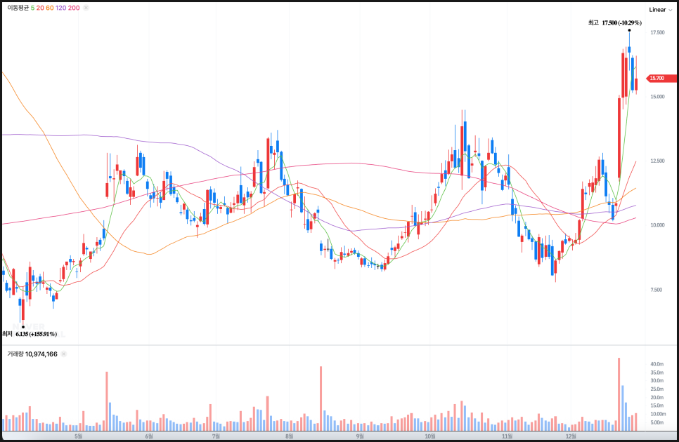 이제 일봉 차트입니다. 가장 최근 구간에서 주가는 10달러 부근에서 충분히 시간을 보낸 뒤, 거래량을 동반하며 단기간에 15달러대 중반까지 급하게 치고 올라왔습니다. 여러 이동평균선을 한 번에 정리하면서 나온 추세성 움직임에 가까운데요.