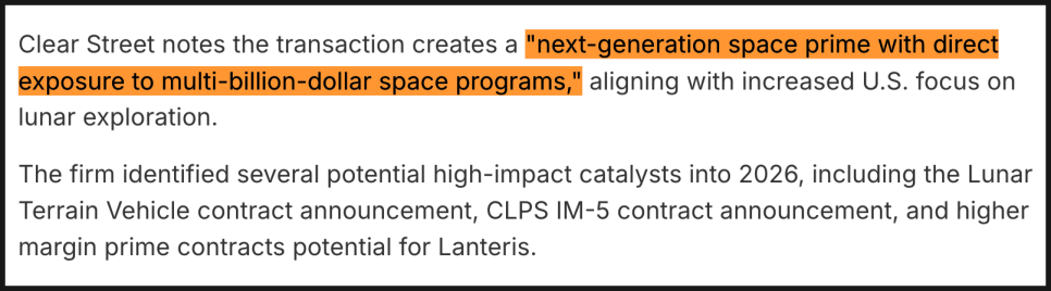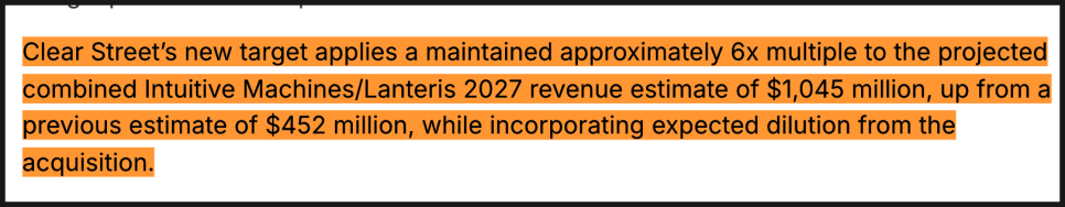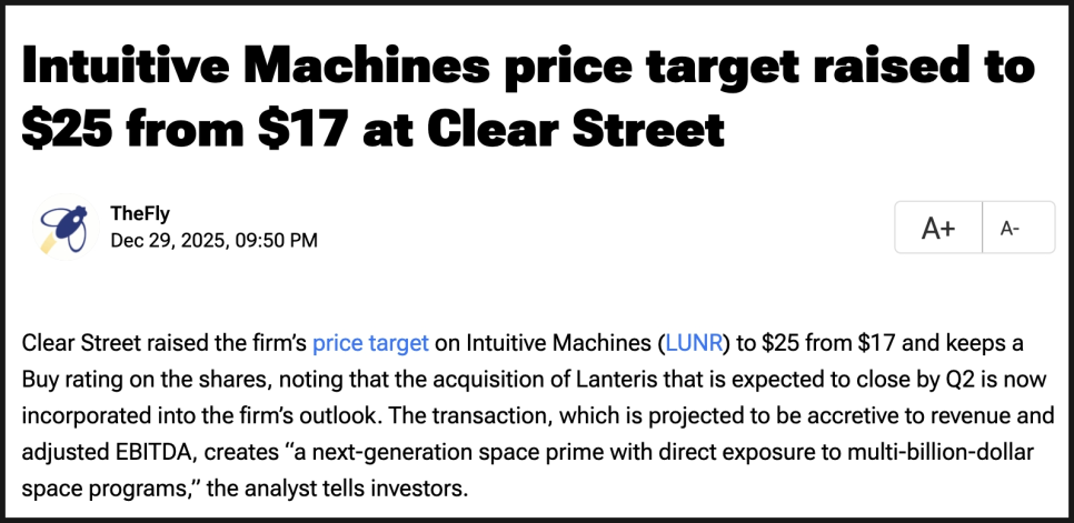 먼저 가장 최근 클리어 스트리트(Clear Street)의 목표 주가 상향이 있었는데요. 클리어 스트리트는 최근 리서치에서 인튜이티브 머신스의 목표 주가를 25달러로 제시하며, 랜테리스(Lanteris) 인수 덕분에 회사의 중장기 성장 스토리가 이전보다 훨씬 명확해졌다고 평가했습니다.