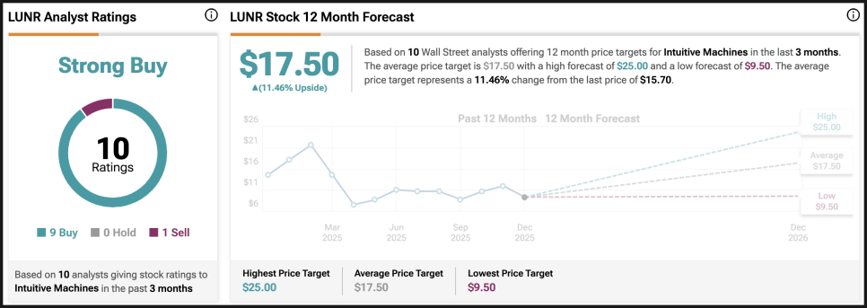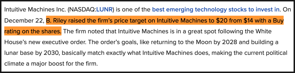클리어 스트리트 외에도 다른 증권사들의 시각 역시 대체로 긍정적입니다. B. 라일리(B. Riley)는 2025년 12월 22일 보고서에서 인튜이티브 머신스에 대해 Buy(매수) 의견을 유지하면서 목표 주가를 기존 14달러에서 20달러로 상향했습니다. B. 라일리는 이번 상향의 가장 큰 이유로 백악관의 우주 정책 실행 명령과 회사의 사업 방향이 매우 밀접하게 맞아떨어진다는 점을 들었습니다.