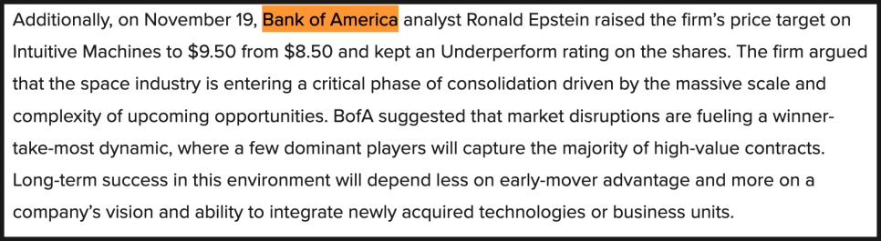 뱅크오브아메리카는 우주 산업이 이제 본격적인 통합과 재편 국면에 들어가고 있다고 봤습니다. 프로젝트 규모와 기술 복잡성이 급격히 커지면서, 결국 소수의 기업만이 대형 계약을 대부분 가져가는 ‘승자독식에 가까운 구조’로 흘러갈 가능성이 높다는 판단입니다. 이 관점에서 보면, 초기 시장 진입이나 기술 시연보다는 장기적인 비전과 인수합병을 포함한 통합 역량이 더 중요해진다는 것인데, 뱅크오브아메리카는 인튜이티브 머신스가 이런 환경에서 최종 승자가 될 수 있을지는 아직 확신하기 어렵다는 입장을 유지하고 있습니다.