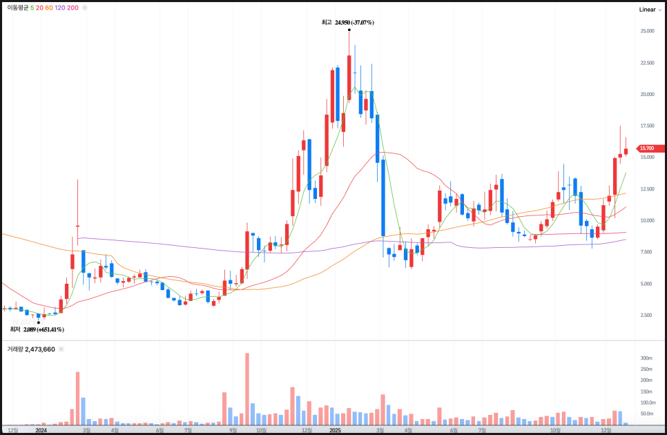 이후 주봉 차트에서 중요한 변화는 2024년 하반기 이후입니다. 주가가 더 이상 저점을 낮추지 않고 5달러대에서 바닥을 다진 뒤, 점진적으로 우상향 흐름을 만들기 시작합니다. 이 구간에서는 거래량이 과거 급등기만큼 폭발하지는 않지만, 하락 시 거래량이 줄고 상승 시 거래량이 늘어나는 비교적 정상적인 구조가 나타납니다. 이벤트 기대보다는 정책, 수주, 사업 구조 같은 중장기 요소들이 가격에 반영되기 시작했음을 시사하는 대목입니다.