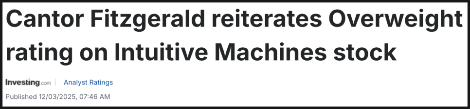 한편 캔터 피츠제럴드(Cantor Fitzgerald)는 2025년 12월 3일 인튜이티브 머신스에 대한 Overweight 의견과 16달러 목표 주가를 재확인했습니다. 캔터 피츠제럴드 역시 랜테리스 인수가 회사의 구조적 성장에 중요한 전환점이라는 점을 강조했는데, 인수 이후 통합 회사 기준으로 연간 매출이 8억 5천만 달러를 넘어설 수 있고, 조정 EBITDA가 흑자 전환할 여지도 있다고 전망했습니다. 또 현재 수주 잔고와 비교했을 때, 인수 효과로 수주 기반이 크게 확대될 것으로 보고 있습니다.