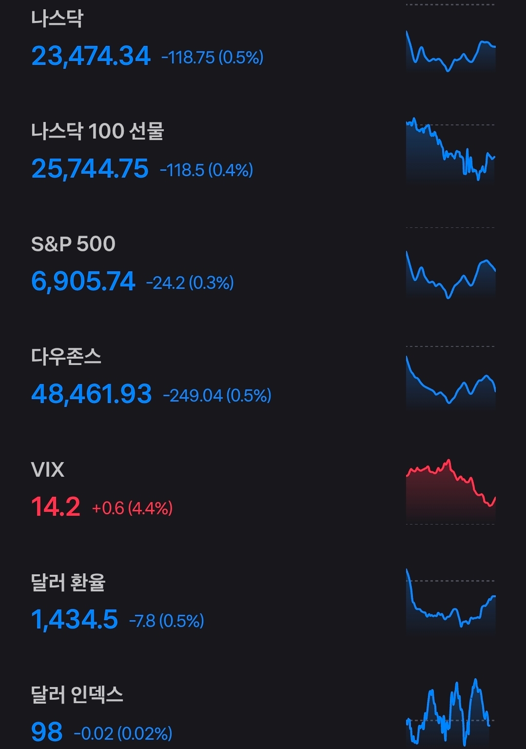 나스닥과 다우가 각각 약 0.5% 내외로 밀리고 S&P500도 약세를 보이며 단기 과열을 식히는 흐름이 나타났습니다. 변동성 지표는 14대 초반에서 반등하며 위험 선호가 살짝 주춤했고 달러 환율은 1,434원대에서 하락하며 원화가 강세를 보인 점이 눈에 띕니다. 공포탐욕지수는 49로 중립 구간에 머물러 있는데 과열도 패닉도 아닌 상태에서 재료에 따라 장이 흔들릴 수 있는 전형적인 구간으로 해석됩니다.