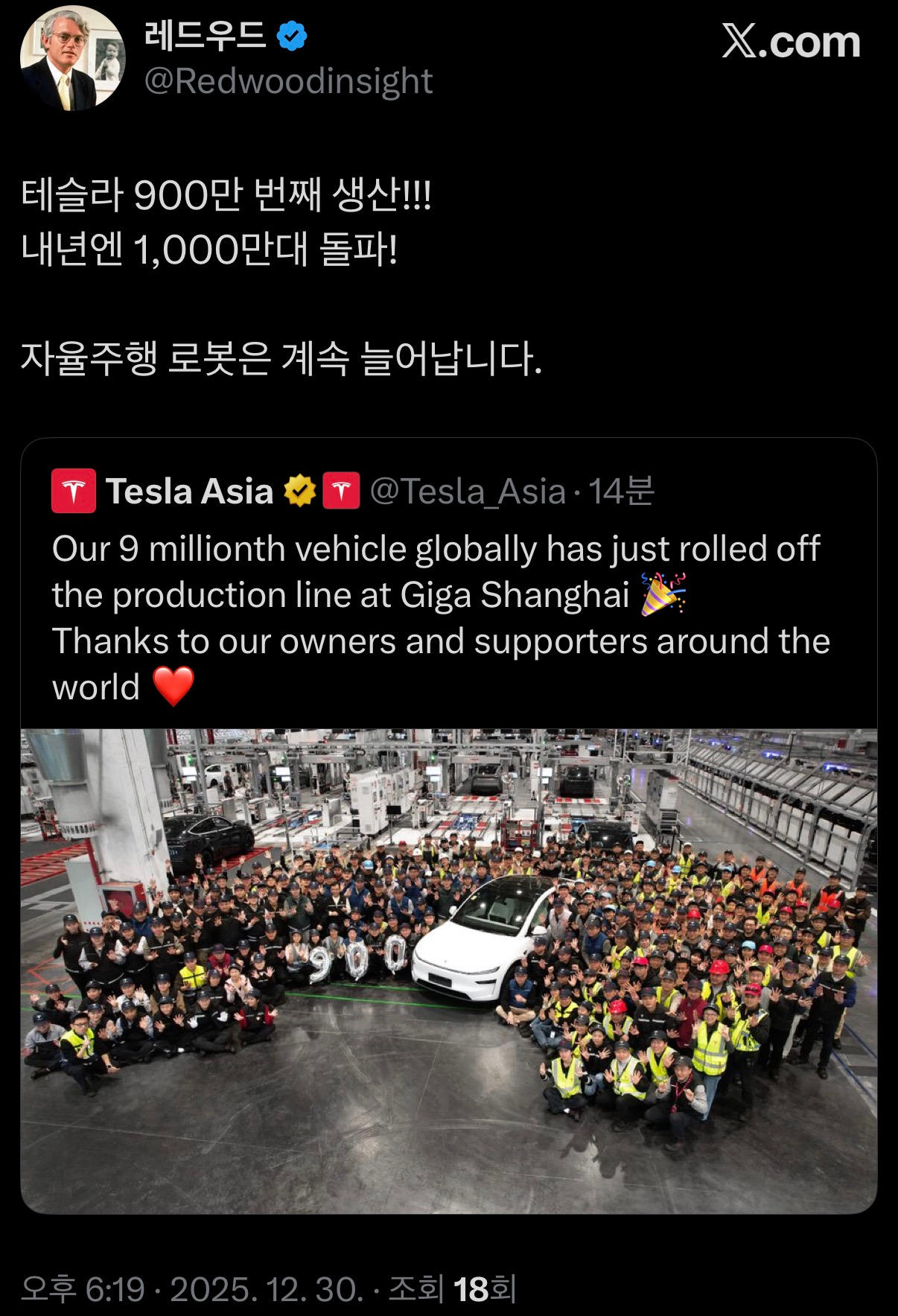테슬라가 누적 900만 번째 로봇을 생산했네요.