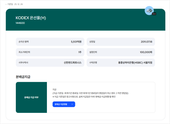 은ETF로는 KODEX 은 선물 ETF, TIGER 금은선물이 있다. KODEX 은 선물 ETF의 경우 미국 상품거래소(S&P GSCI SILVER INDEX TOTAL RETURN)에서 거래되는 은 선물 가격의 움직임을 추적하여 은에 투자할 수 있는 상품이다. 은을 직접 보유하는 것이 아니라 선물에 직접 투자하는 것이고, 환헤지(환율을 고정)를 통해 환율 변동에 따른 위험을 최소화한다. 개인연금의 경우에도 은 선물 ETF를 일반 주식처럼 매수하며 모을 수 있다. 여기서 금과 은의 추종하는 지수는 S&P GSCI SILVER RETURN 지수는 스탠다드앤푸어스가 시작한 은 선물 지수이다.