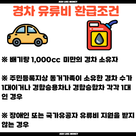 그러나 1세대에 경합승용차 2대와 경합승합자 2대를 소유한 경우에는 환급대상이 아니다. 수입 경차나 중고 경차를 구입한 경우에도 해당 조건을 충족한다면 유류비를 환급받을 수 있다. 마지막으로 장애인 또는 국가유공자 유류비를 지원받지 않아야 한다.