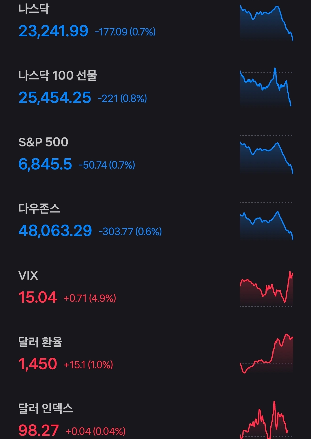 미국 주요 지수는 동반 약세 흐름이 나타났고 변동성 지표는 상승했지만 절대 수준은 과열로 보기 어려운 구간에 머물렀습니다. 동시에 환율이 크게 움직이며 달러 자산의 평가가치에 민감한 하루였고 달러 인덱스는 큰 방향성보다도 단기 변동이 부각되는 모습이었습니다. 투자 심리는 중립 영역에 위치해 과도한 낙관도 과도한 공포도 아닌 상태라 이벤트에 따라 포지션이 빠르게 바뀌는 장세가 이어질 수 있는 환경으로 읽힙니다.