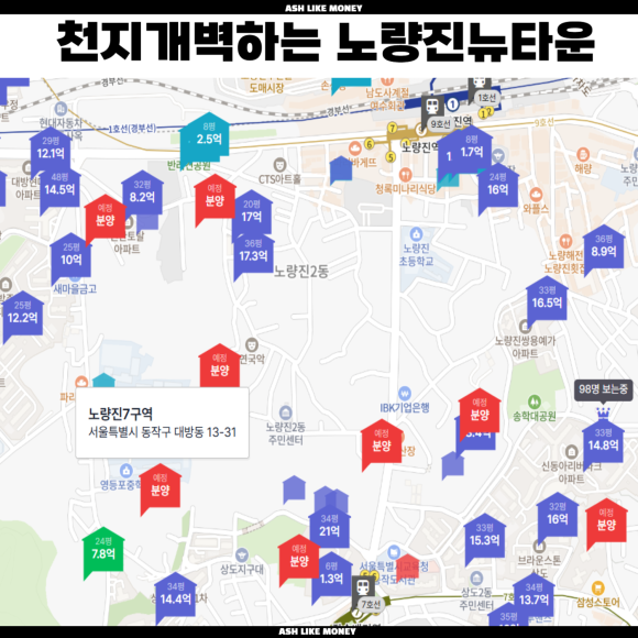 노량진뉴타운은 들리는 풍문으로는 무려 피가 20억까지 붙었다고 이야기가 돌 정도로 핫한 재개발 구역이고 동남권 최고의 입지이다. 과거엔 고시생들이 모여 공무원이 되기 위하여 공부하던 곳이었지만, 공무원의 인기가 없어지면서 학원들도 점점 사라져가고 월세 받던 집주인들도 시대가 바뀜에 따라 개발에 손을 들어주었다.