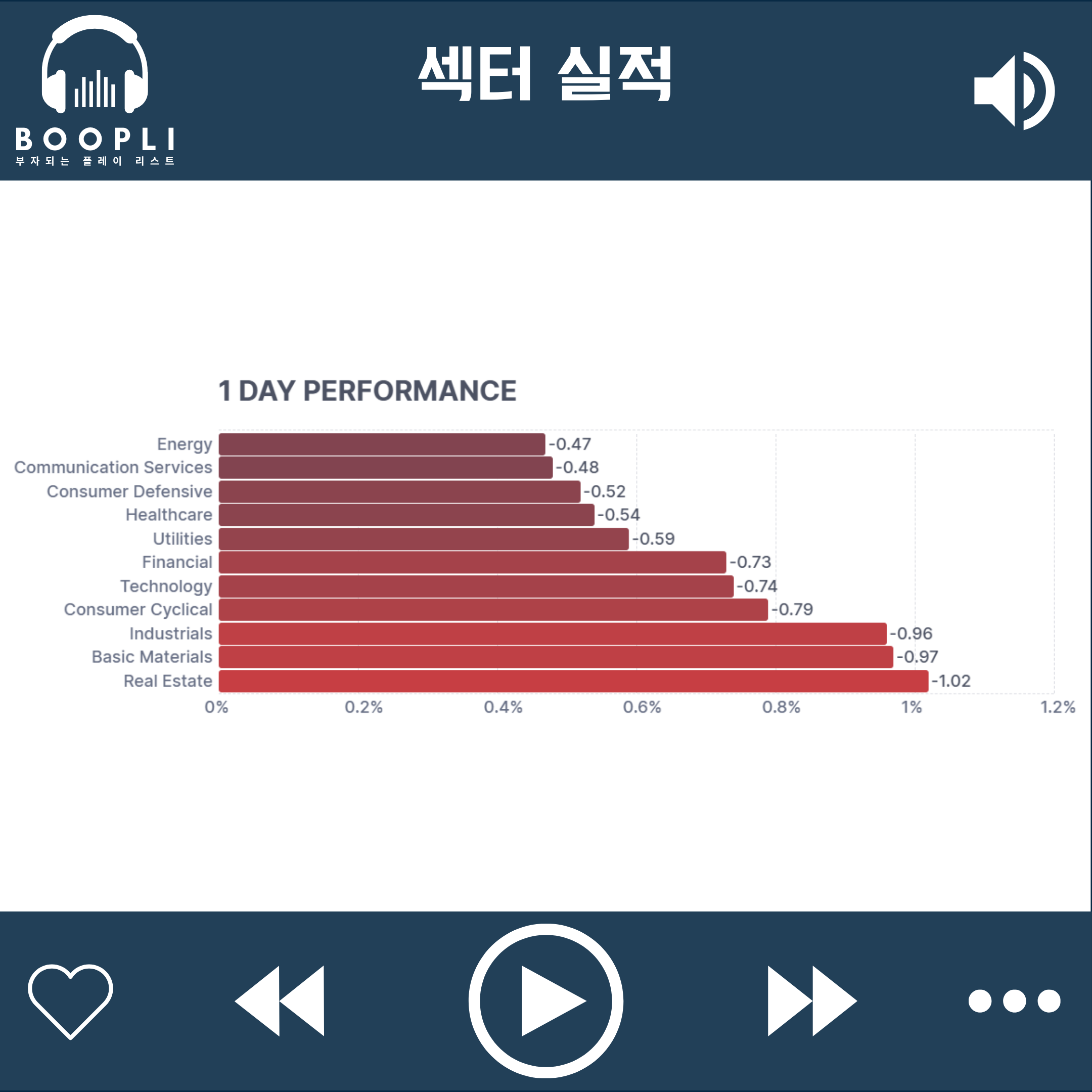 부동산 섹터가 하락을 주도했고, 이어서 원자재, 산업재, 소비 순환재, 기술, 금융, 유틸리티, 헬스케어, 경기 방어주 순으로 약세