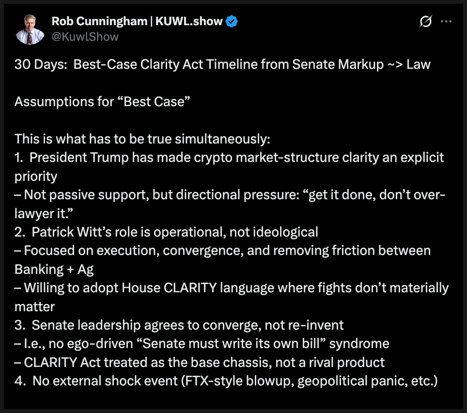 한편 시장 전문가 롭 커닝엄이라는 인물은 “가장 이상적인 시나리오”를 기준으로 한 타임라인도 제시했습니다. 그의 설명에 따르면 첫 주에는 상원 은행위원회와 농업위원회가 각각 마크업을 마무리하고, 이 과정에서 수정안은 사전에 조율돼야 본회의에서 깜짝 변수 없이 넘어갈 수 있다고 봤습니다.