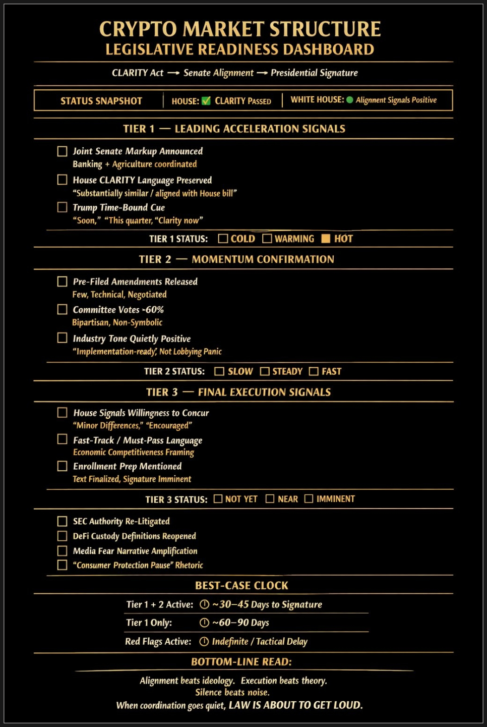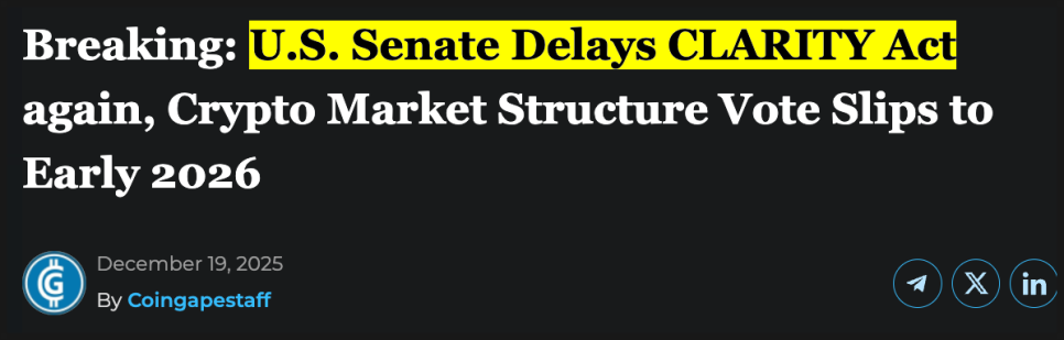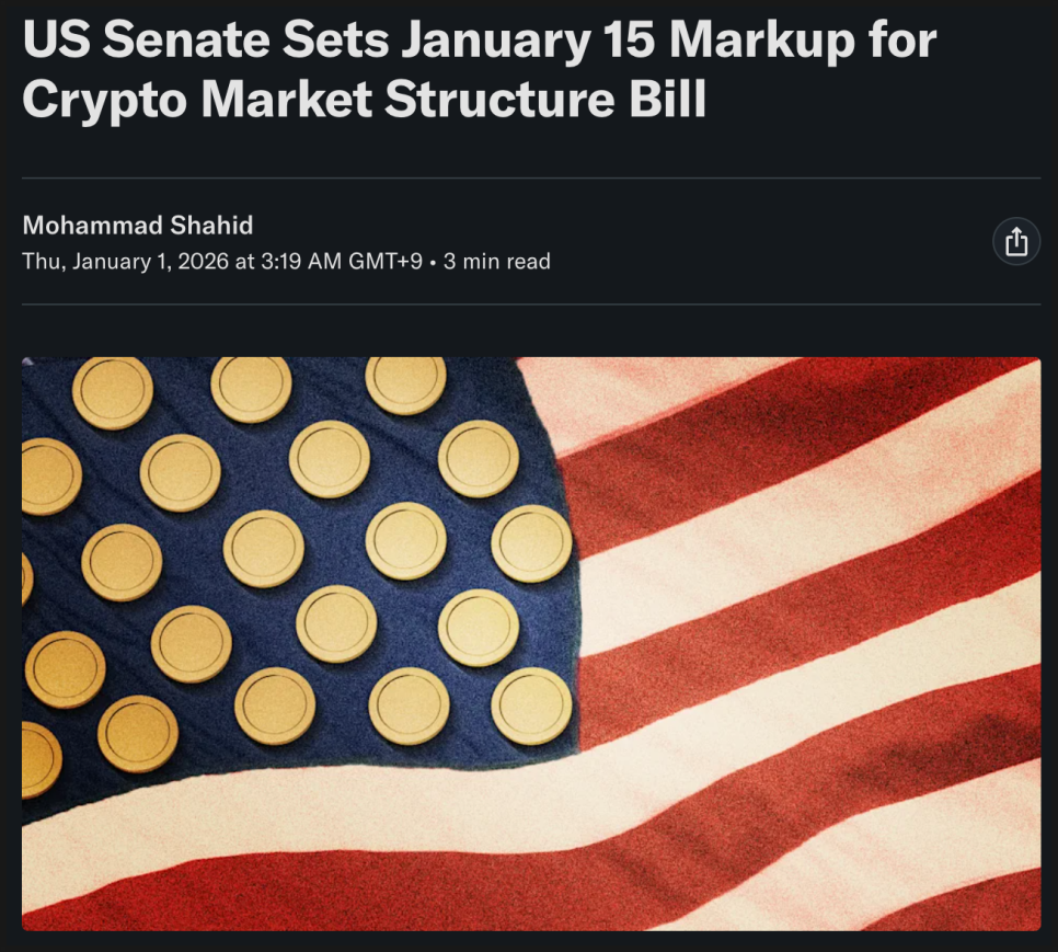 미국 크립토 규제 쪽에서 꽤 중요한 뉴스가 하나 나왔습니다. 미국 상원 은행위원회가 이른바 클래러티 법(CLARITY Act)의 마크업 날짜를 1월 15일로 잡았다는 소식입니다. 마크업이라는 건 법안 문구를 놓고 수정안과 세부 조항을 본격적으로 다듬는 단계인데요, 이제 진짜 표결을 향해 움직이기 시작했다는 신호로 볼 수 있겠습니다.