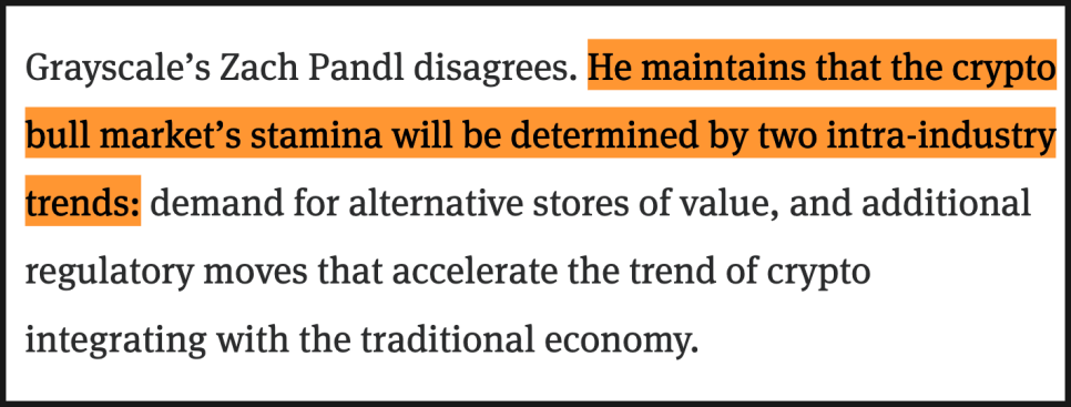 반대로 그레이스케일의 팬들은 아직 크립토 내부 요인이 더 중요하다고 봅니다. 대안적 가치 저장 수단에 대한 수요, 그리고 크립토가 전통 금융 시스템 안으로 더 깊이 편입되는 규제 변화가 시장의 전망을 결정할 거라는 겁니다. 이 관점에서는 비트코인이 가장 유리합니다. 비트코인은 이미 ‘디지털 금’이라는 내러티브가 비교적 명확하게 자리 잡았기 때문이죠.