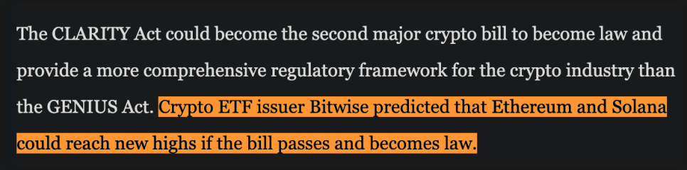 시장에서는 이 법안을 꽤 중요하게 보고 있습니다. 만약 통과된다면, 기존의 단편적인 규제보다 훨씬 넓은 틀의 크립토 규제 체계를 제공하는 두 번째 핵심 법안이 될 수 있기 때문이죠. 실제로 ETF 운용사 Bitwise는 이 법안이 법으로 확정될 경우 이더리움과 솔라나가 새로운 고점을 시도할 수 있다는 전망을 내놓기도 했습니다.