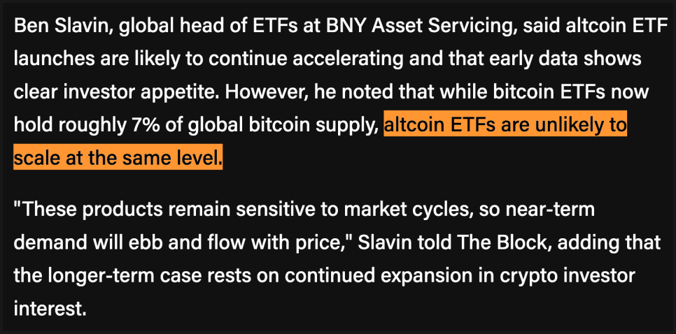 한편 BNY 자산서비스의 ETF 총괄 벤 슬래빈은 알트코인 ETF 출시가 앞으로 더 빨라질 거라고 보면서도, 비트코인과 같은 규모로 성장하긴 어렵다고 말합니다. 비트코인 ETF가 전 세계 비트코인 공급량의 약 7퍼센트를 보유하고 있는 반면, 알트코인 ETF는 그 수준까지 가기 어렵다는 판단이죠. 가격 사이클에 따라 수요가 쉽게 흔들릴 수 있다는 점도 짚었습니다.