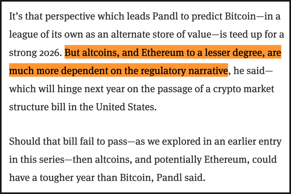 다만 알트코인과 이더리움은 이야기가 다릅니다. 팬들은 이들 자산이 2026년에 어떤 내러티브를 맞이하느냐에 따라 성과가 크게 갈릴 수 있다고 봅니다. 특히 미국에서 논의 중인 크립토 시장 구조 법안이 핵심 변수입니다. 이 법안이 통과되면 알트코인과 이더리움도 제도권 내 역할이 분명해질 수 있지만, 만약 실패한다면 비트코인보다 훨씬 힘든 한 해를 보낼 수 있다는 겁니다. 그래서 이번 컨텐츠를 규제 소식으로 시작한 것이죠.