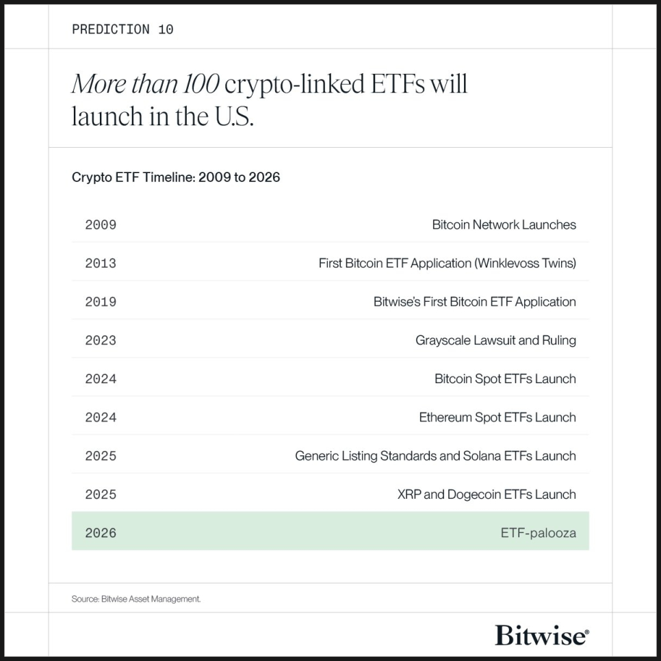 한편 비트와이즈는 훨씬 공격적인 전망을 내놓았습니다. 승인 절차가 빨라지면서 미국에서만 100개가 넘는 신규 크립토 ETF가 나올 수 있고, ETF가 주요 디지털 자산의 신규 공급량을 사실상 전부 흡수하는 구조가 될 수도 있다는 주장입니다. 이 관점에서는 ETF를 단기 투기 수단이 아니라, 구조적인 수요 엔진으로 보고 있습니다.