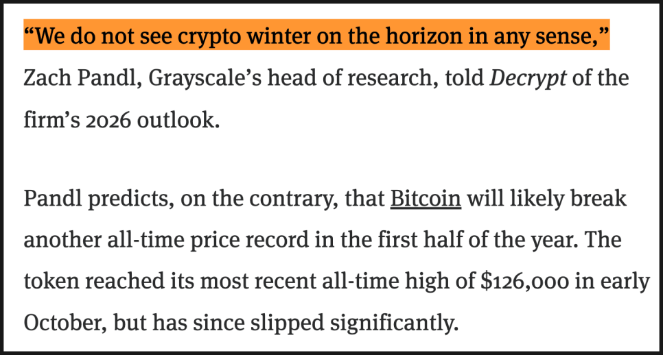 먼저 Grayscale의 리서치 총괄인 잭 팬들은 2026년에 크립토 윈터가 올 가능성은 거의 없다고 봅니다. 오히려 비트코인은 2026년 상반기에 다시 한 번 사상 최고가를 경신할 가능성이 높다고 봤습니다. 비트코인은 2025년 10월 초에 약 12만6천 달러로 고점을 찍은 뒤 조정을 받았지만, 상승 흐름이 끝났다고 보지는 않는다는 이야기죠.