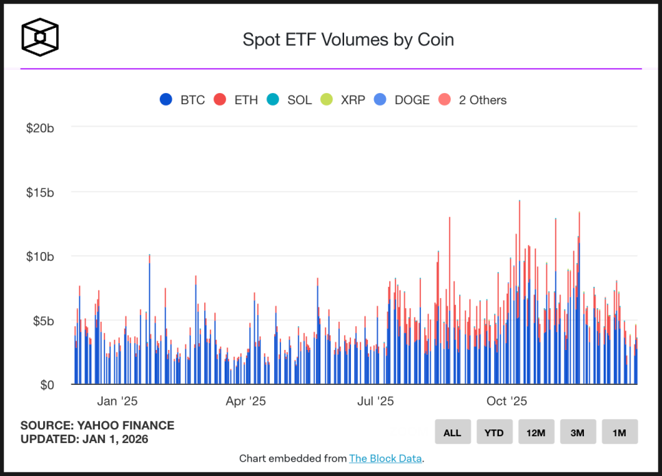 적은 금액은 아닙니다만, 비트코인과 비교하면 체급 차이가 큽니다. 비트코인 현물 ETF는 2024년 1월 출시 이후 지금까지 약 569억 달러의 순유입을 기록했습니다. 이 정도 규모의 자금이 꾸준히 들어오다 보니, 비트코인은 단순 현물 거래를 넘어 ETF를 활용한 커버드콜 같은 파생 전략까지 활성화됐고, 그 결과 올해 내내 변동성이 점점 낮아지는 흐름을 보였습니다.