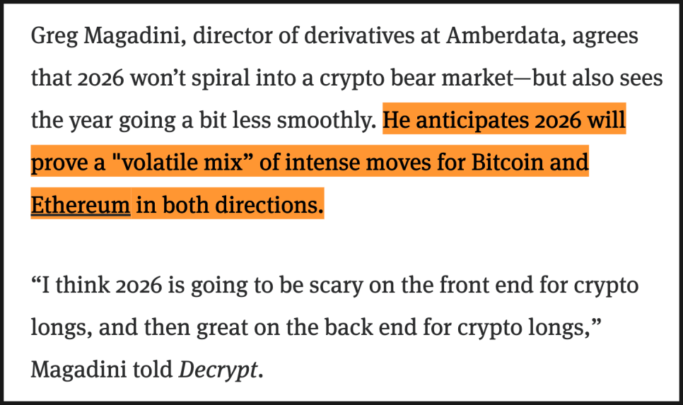 반면 Amberdata의 파생상품 총괄인 그렉 마가디니의 생각은 좀 다른데, 2026년이 약세장은 아니라고 보면서도, 과정은 훨씬 거칠 수 있다고 봅니다. 그의 표현으로는 “앞부분은 무섭고, 뒷부분은 굉장히 좋은 해”라는 겁니다.