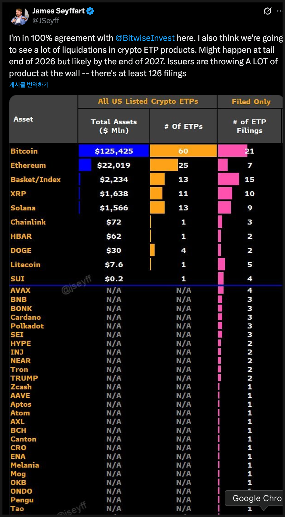 다만 모두가 낙관적인 건 아닙니다. 블룸버그 인텔리전스의 제임스 세이퍼트는 현재 최소 126개의 크립토 ETP 신청이 대기 중이라며, 발행사들이 “일단 다 던져보고 반응을 보자”는 식으로 움직이고 있다고 평가했습니다. 승인 자체는 계속되겠지만, 자금이 붙지 않는 상품은 2026년 말이나 2027년쯤 정리 수순에 들어갈 수 있다는 경고도 덧붙였습니다.
