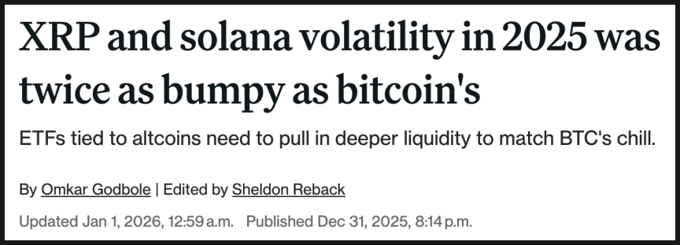 한편 2025년 한 해 비트코인이 영 힘을 못 쓴 가운데, 알트코인의 흐름은 어땠을까요? XRP와 솔라나 등 알트코인의 변동성은 비트코인보다 훨씬 컸습니다. 2025년 한 해를 기준으로 보면, XRP와 솔라나의 변동성은 비트코인의 거의 두 배 수준이었다는 분석이 있는데요. 시장이 성숙 단계로 지나가며 비트코인의 변동성이 줄었다는 기대가 있었지만, 최소한 알트코인 쪽에서는 아직 그렇다고 말하기 어려운 데이터가 나온 셈이죠.