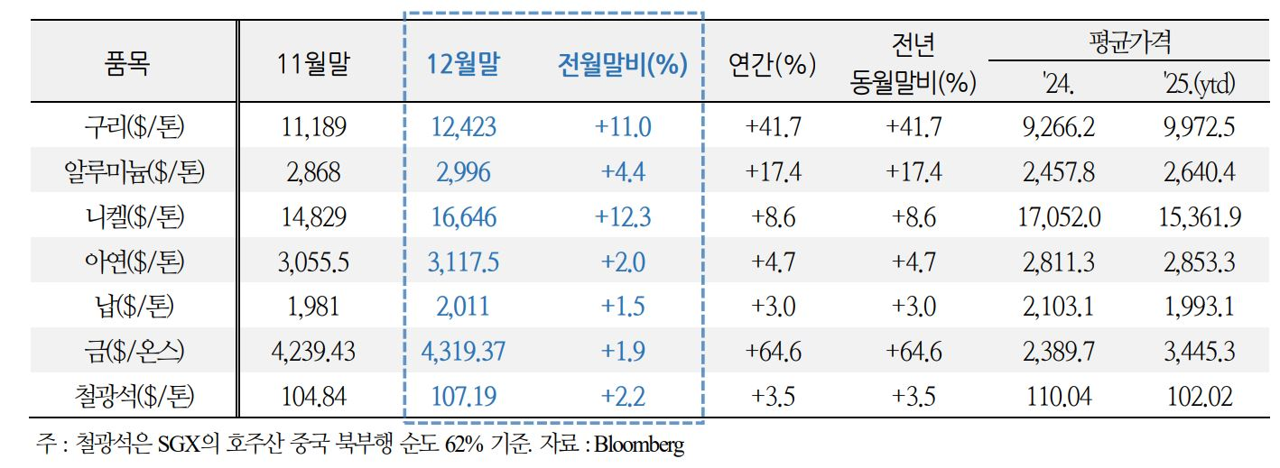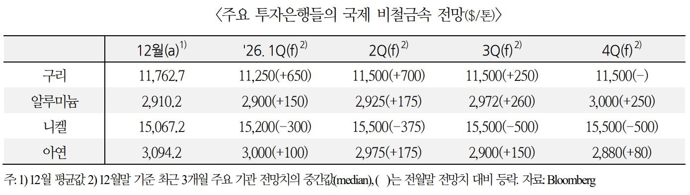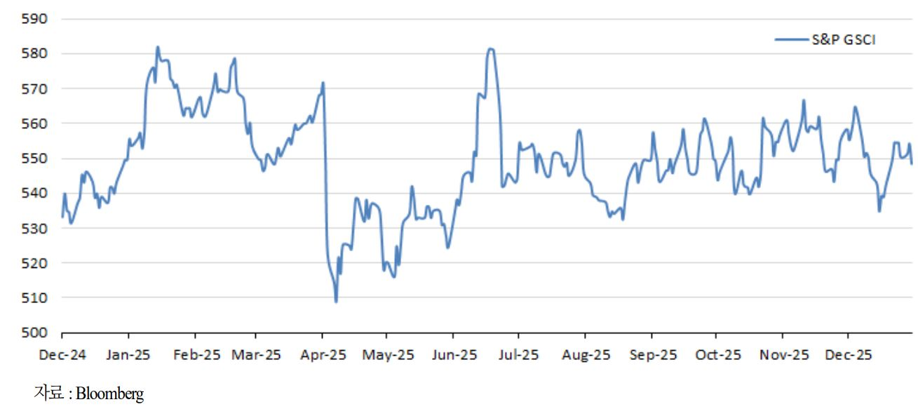 25년 12월 S&P GSCI는 2개월 연속 약세를 보이고 있으며, 국제 유가 또한 약세, 비철금속은 강세 분위기 속에 변동성 확대 가능성이 있는 것으로 분석하고 있는데요.