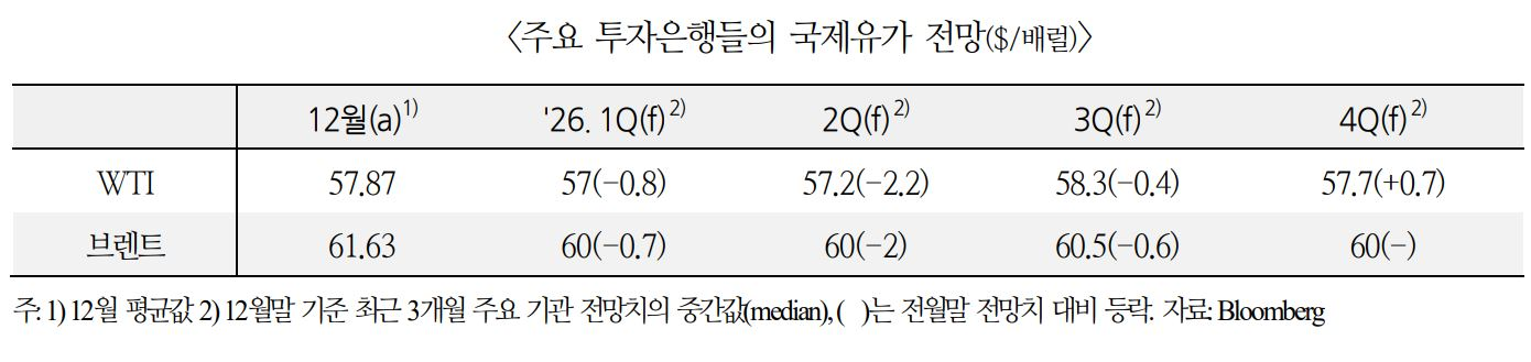 ㅇ 국제유가는 낙폭과대에 따른 저가매수세 유입이 기대되는 상황이나 대규모 공급 과잉에 대한 우려가 지속되는 한 약세 분위기의 반전은 어려울 전망. 베네수엘라 정세와 러-우 평화협상 경과에 따라 단기 변동성 확대 가능성은 상존