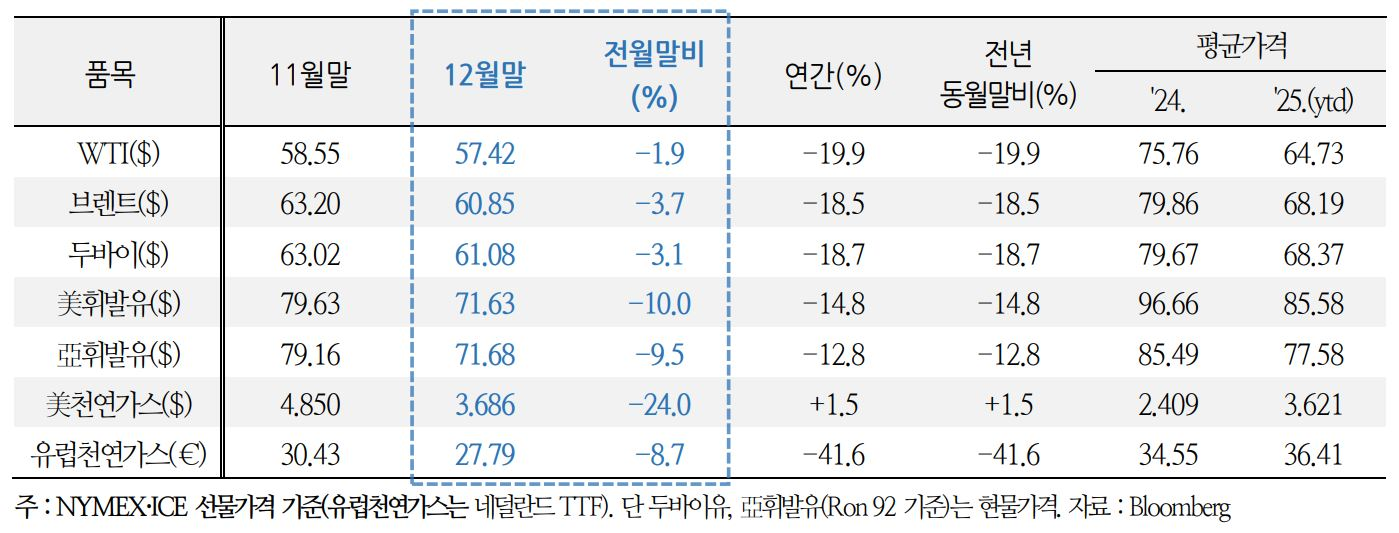 ㅇ 국제유가는 미국의 베네수엘라에 대한 공세 강화에도 공급과잉 우려 지속, 투기 매도세 등으로 5개월 연속 하락. 러-우 평화 협상 기대감도 전반적인 하방압력으로 작용