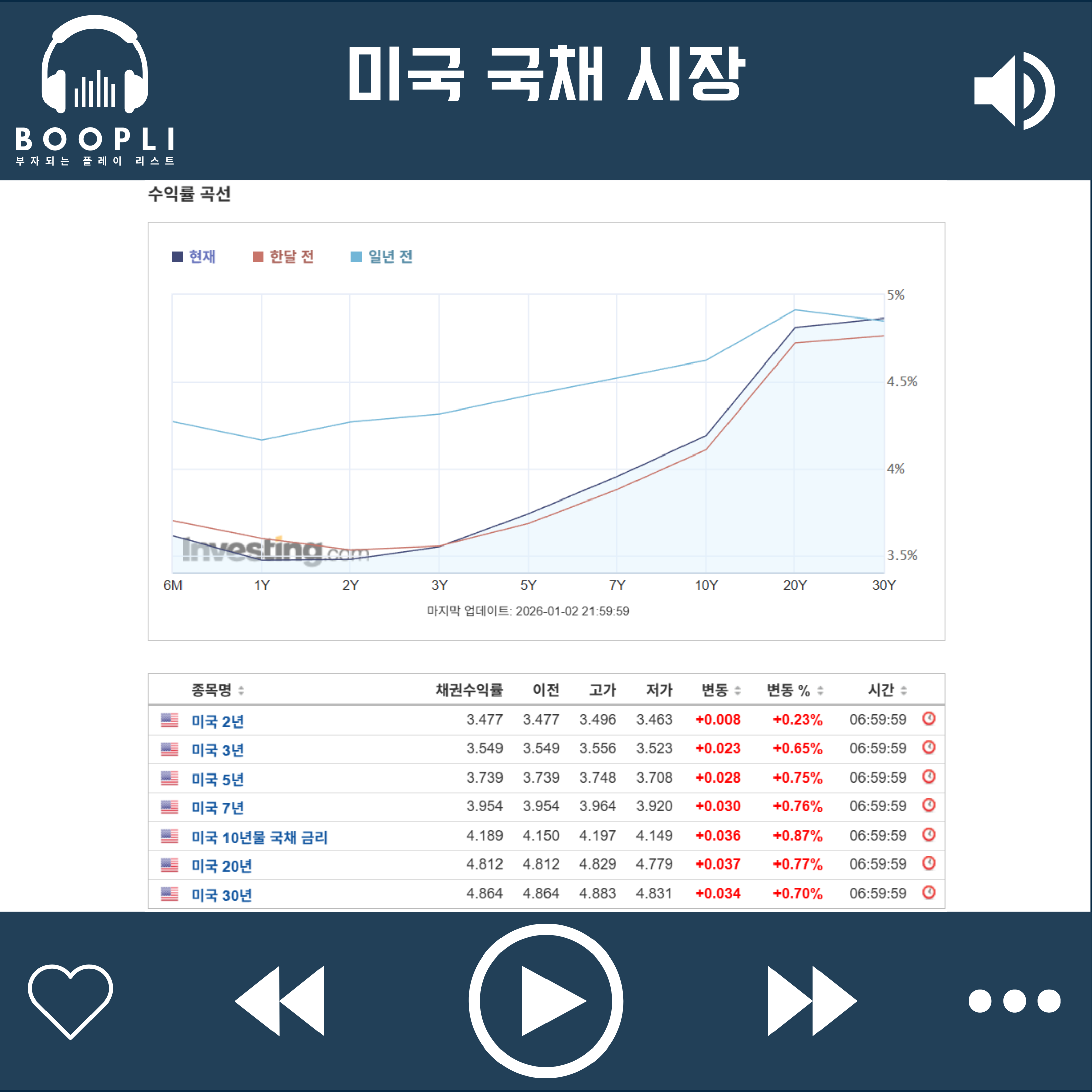 개장 전에는 1월이 유로존 국가들의 국채 발행이 가장 집중되는 시기라는 점이 부담 요인으로 작용하며 독일을 중심으로 유럽 국채 금리가 상승했고, 이러한 흐름이 미국 국채 시장에도 전이되며 미 국채 금리가 동반 상승