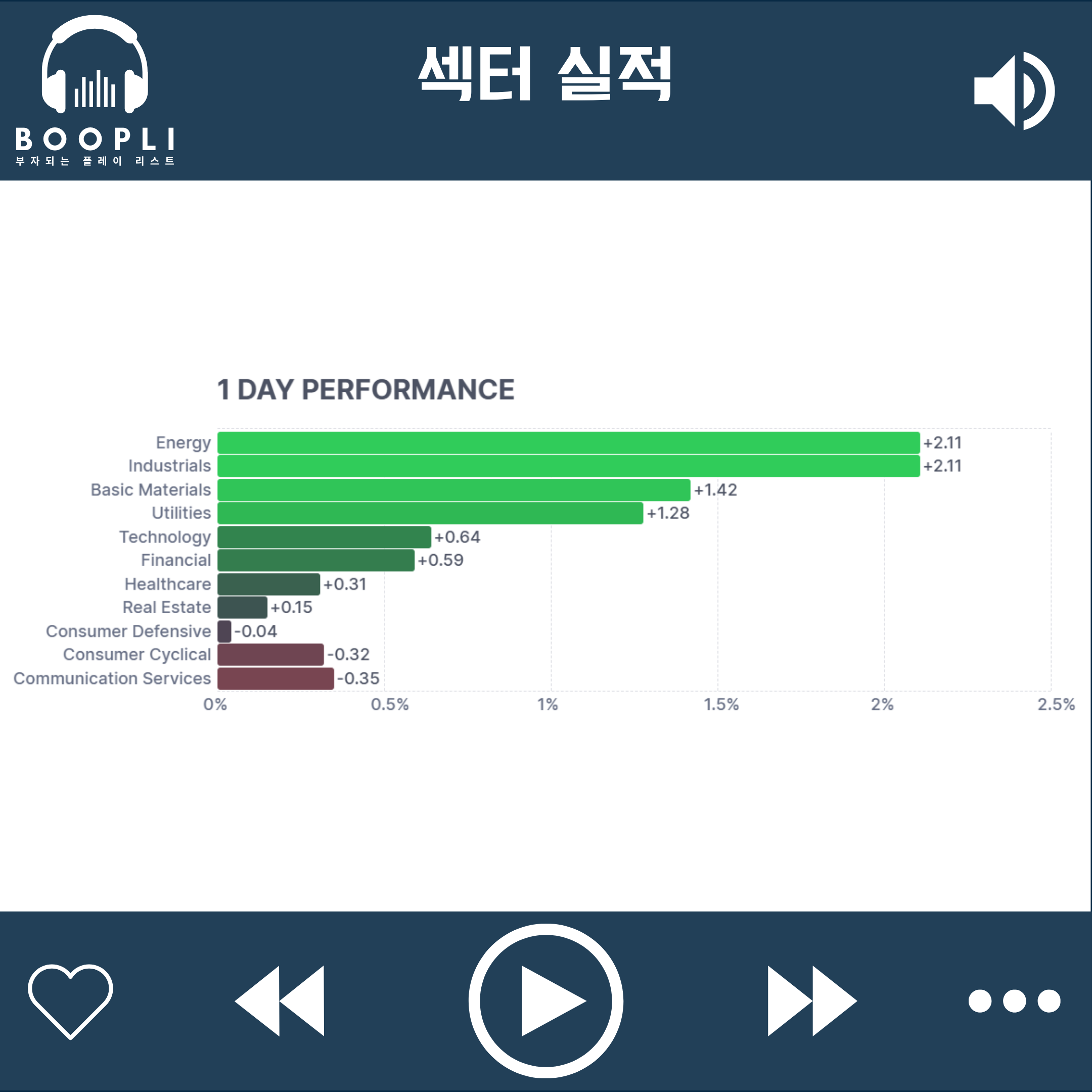 업종별 순환매가 나타나며 에너지 섹터가 상승 주도, 이어서 산업재, 원자재, 유틸리티, 기술, 금융 순으로 강세