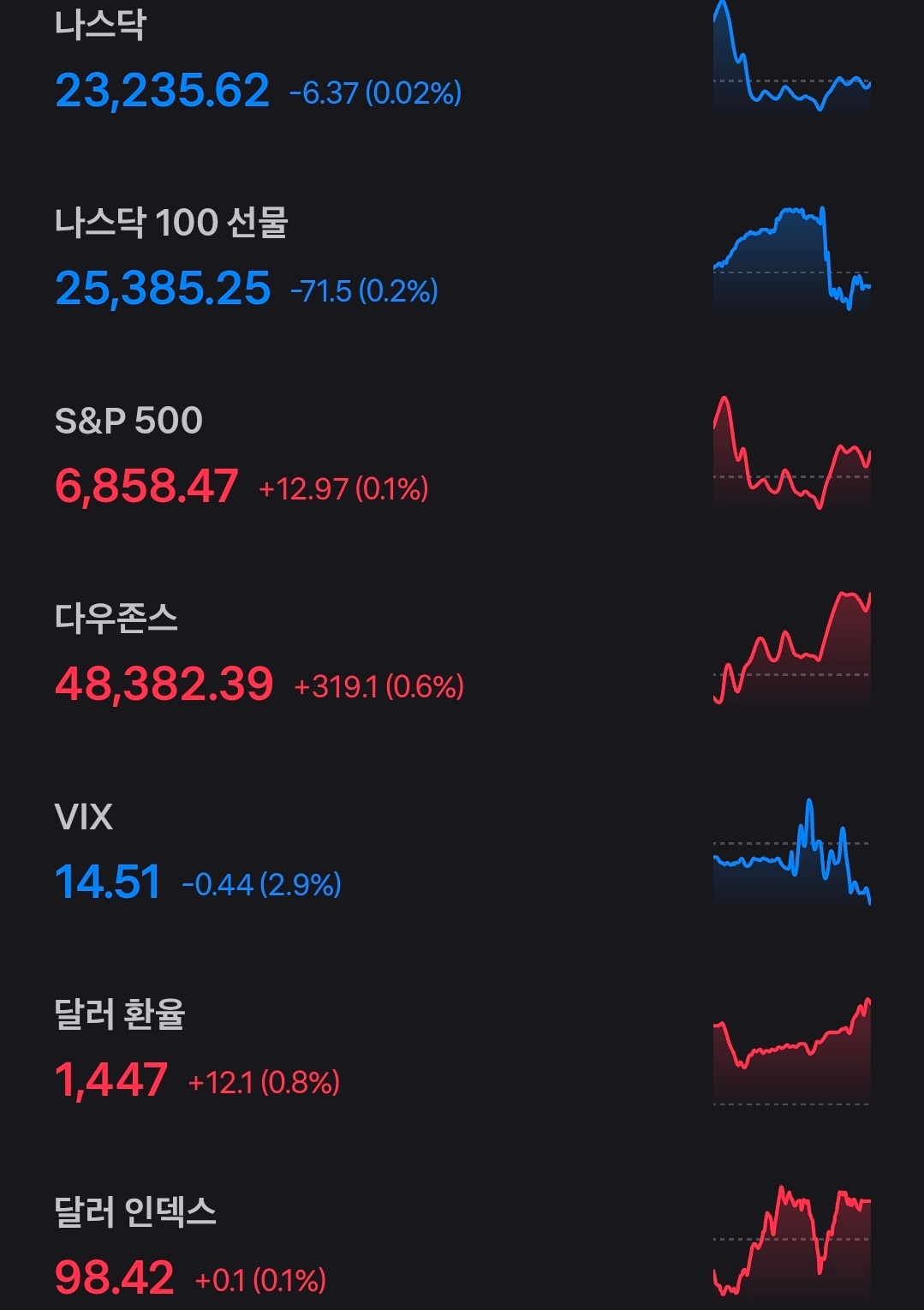 지수는 혼조였고 변동성은 낮아진 구간을 유지했습니다. 다우는 48,382선으로 0.66% 상승했고 S&P500은 6,858선으로 0.19% 상승한 반면 나스닥은 23,235선에서 소폭 밀렸으며 VIX는 14.51까지 내려오며 단기 불안이 크게 확산되는 양상은 아니었습니다. 다만 달러 인덱스가 98선에서 견조했고 원달러 환율이 1,447원대로 올라서면서 위험 선호가 완전히 회복됐다고 보기는 어려운 환경입니다.