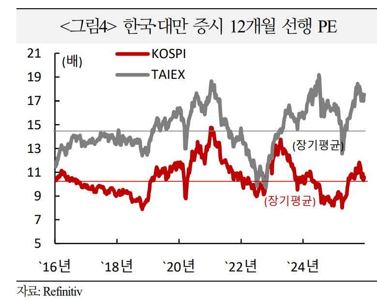 ● 대만 주식 12개월 선행 PE는 17배 내외로 지난 10년 평균 14.7배를 상회. 한편 KOSPI는 10배 수준으로 과거 10년 평균과 유사한 수준이면서 대만 대비 절대적 밸류에이션 수준도 낮음