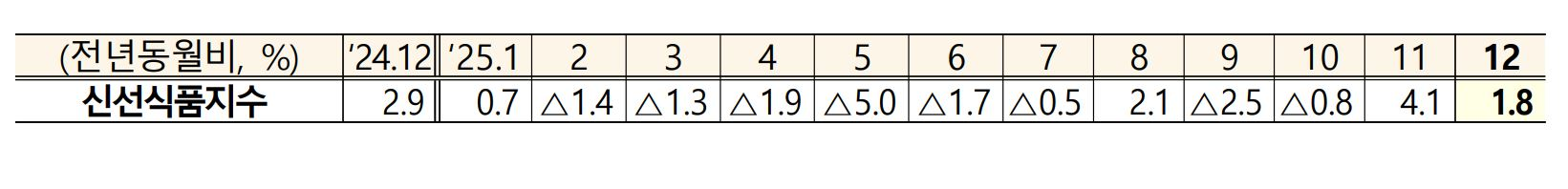 ㅇ 신선식품지수(전년동월비,%,’25.11→12월) : (신선과실)11.5→5.2 (신선채소)△4.7→△5.2 (신선어개)7.4→6.9