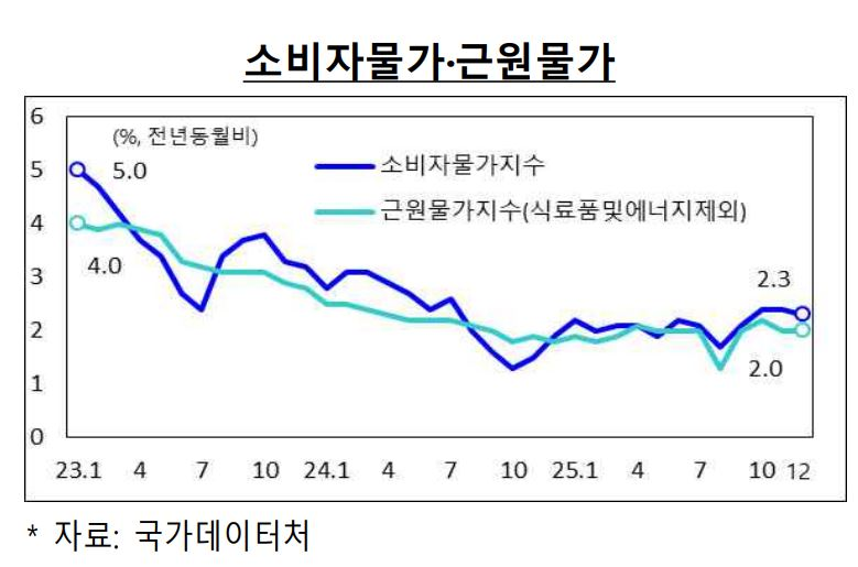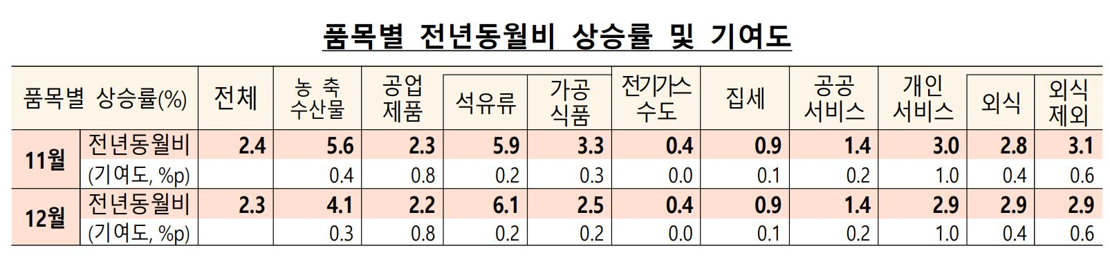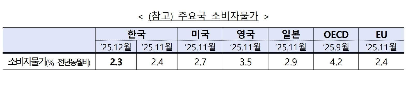 12월 소비자물가는 전년동월비 2.3% 상승 (’25.11월 2.4%)