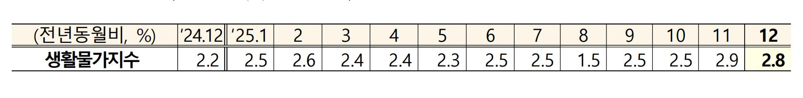 ㅇ 생활물가지수(전년동월비,%,’25.11→12월)