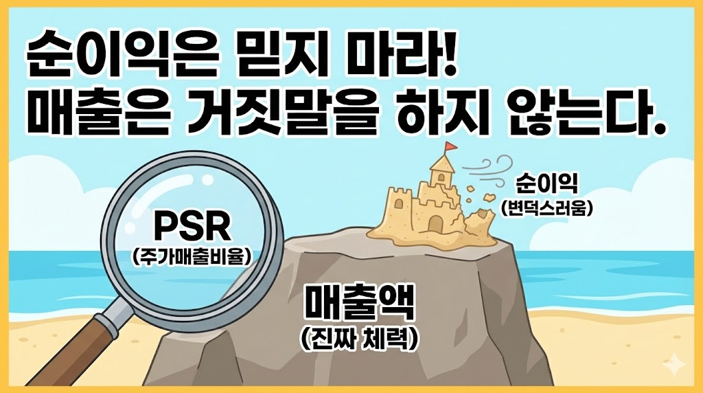 형님들, 재무제표 보실 때 맨 밑에 있는 순이익만 보지 마시고, 맨 꼭대기에 있는 매출액과 'PSR'을 먼저 보십시오. 기업의 진짜 체력은 거기서 나옵니다.