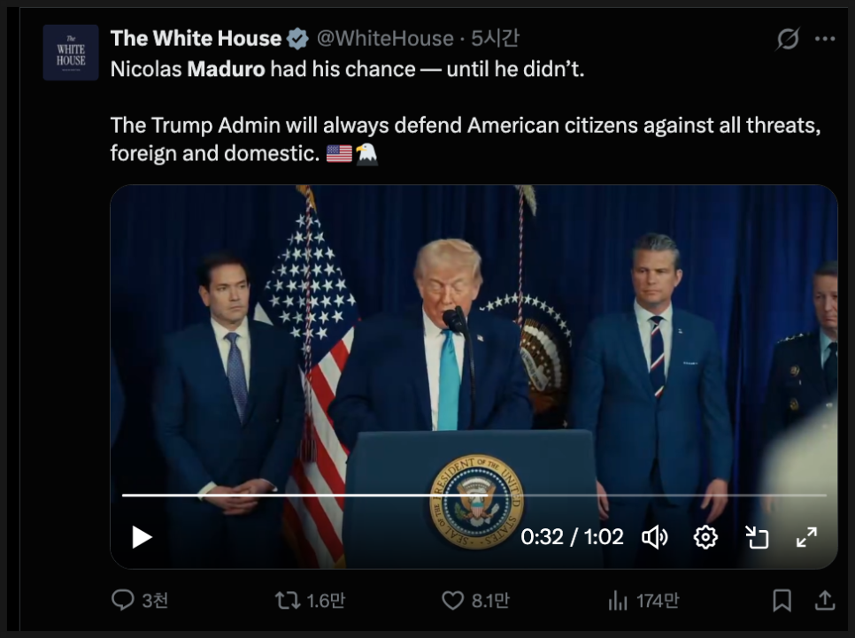 주말 동안 미국이 베네수엘라 대통령 니콜라스 마두로를 체포했다는 소식과 함께 지정학적 긴장감이 커졌는데요. 미국 법무장관 팸 본디가 X를 통해 마두로와 그의 아내 실리아 플로레스가 뉴욕 남부지방법원에서 기소됐다고 밝혔고, 혐의는 마약 테러 공모, 코카인 밀수 공모, 기관총 및 폭발물 소지와 관련된 중범죄들이었죠. 정치 뉴스로만 보면 상당히 강도가 센 이슈입니다.